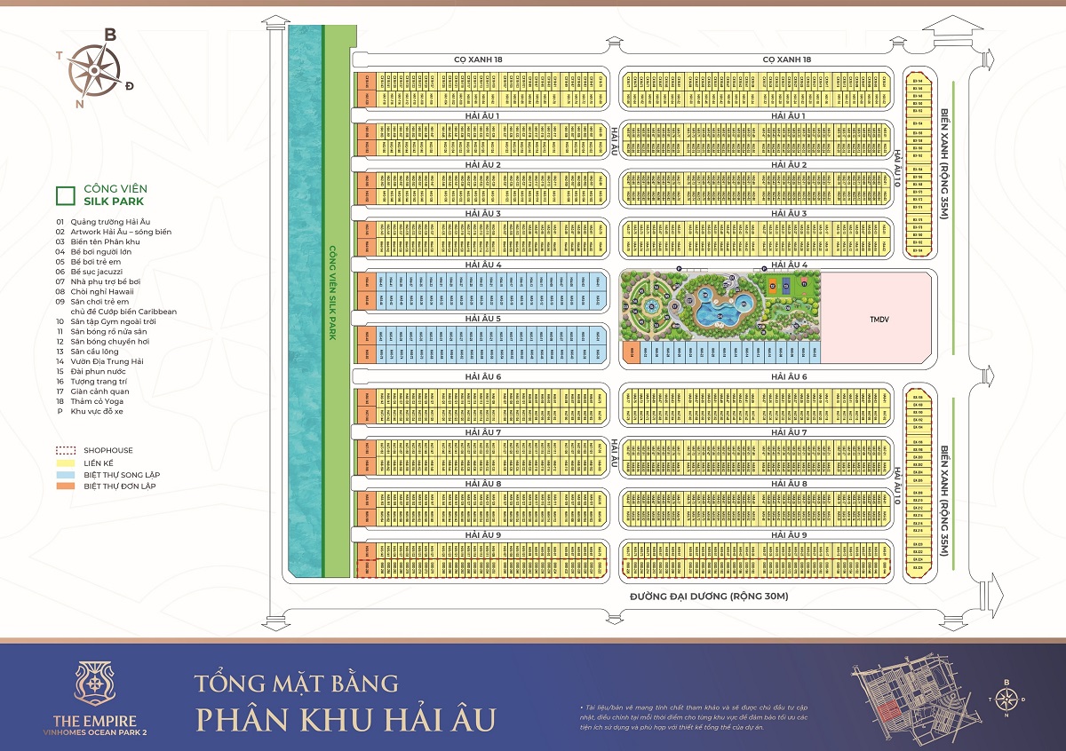 Phân khu Hải Âu tại The Empire – Vinhomes Ocean Park 2 có diện tích 21.5ha với tổng số 1.372 căn thấp tầng được chia làm 10 dãy từ Hải Âu 01 tới Hải Âu 10. Khu Hải Âu nằm dọc theo công viên Silk Park của dự án với 2 tuyến đường huyết mạch là đường Đại Dương rộng 30 m và đường Biển Xanh rộng 35 m, rất thuận tiện cho việc di chuyển tới các khu vực tiện ích nội khu trong dự án cũng như dễ dàng kết nối tới cao tốc Hà Nội – Hải Phòng và đường vành đai 3.5.