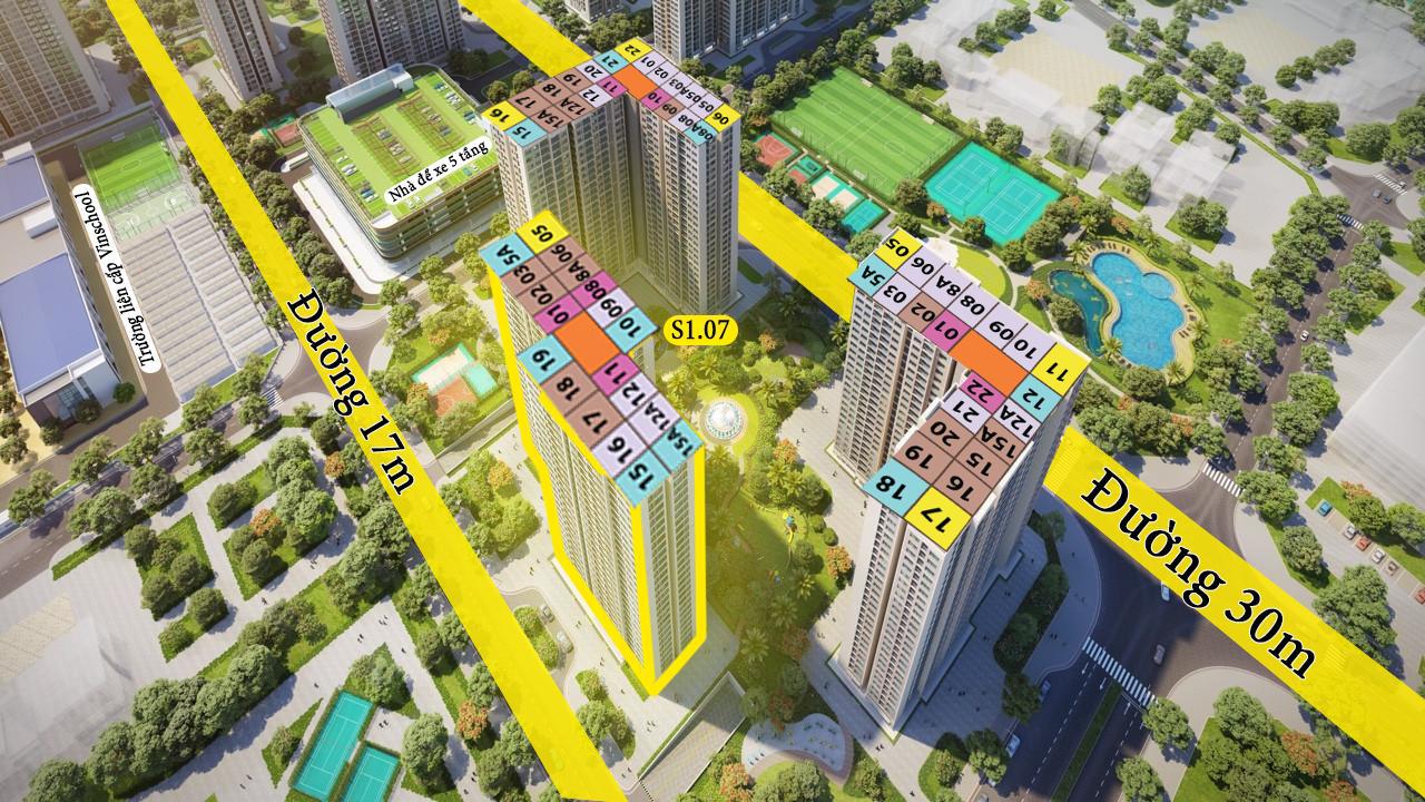 Tòa S1.07 được thiết kế theo hình chữ Z với 28 tầng nổi & 1 tầng hầm để xe, cung cấp ra thị trường khoảng 513 căn hộ.